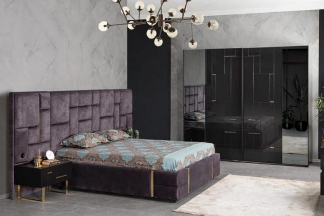 Красиві чорні меблі для спальні Ібіца із золотим оздобленням представлені в нашому магазині меблів у стилі модерн. Ліжко можна зробити у будь-якому кольорі. Тканину можна вибрати за каталогом тканин. Шафа, комод та тумбочки приліжкові прикрашені красивими фасадами.