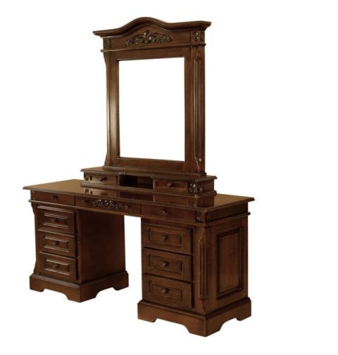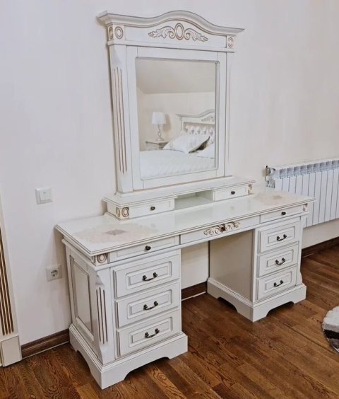 Красивий туалетний столик з натурального дерева від румунської фабрики ARDUDANA можна купити в нашому магазині меблів в Києві. Туалетний столик Марія можна купити в білому кольорі із золотом або в кольорі горіх. Ці моделі є у наявності. Якщо Ви захочете замовити цю модель в іншому кольорі, колір дерева можна вибрати за каталогом викрасів. Пуфик також можна купити в потрібній Вам тканині і кольорі.