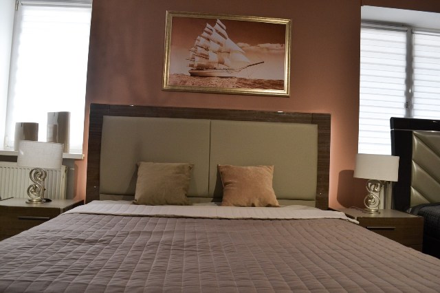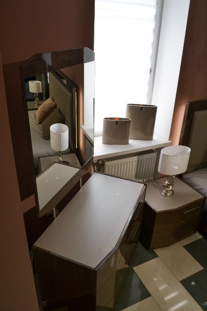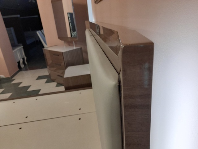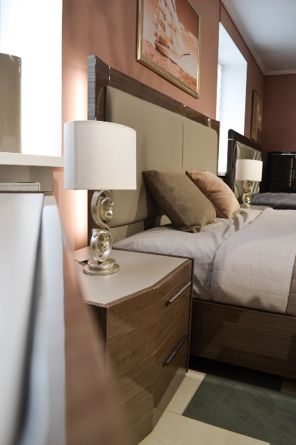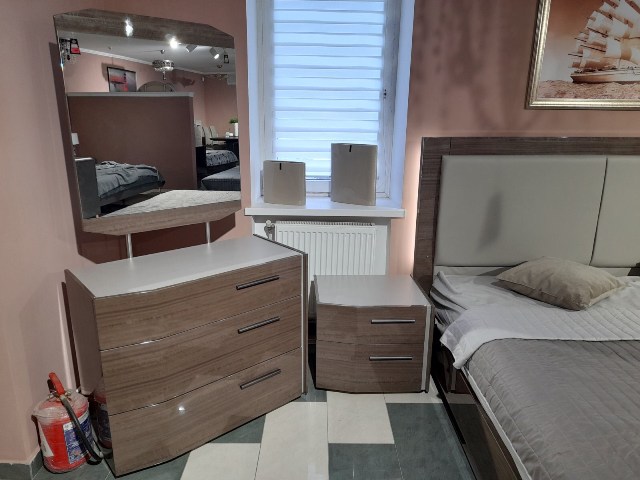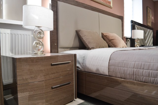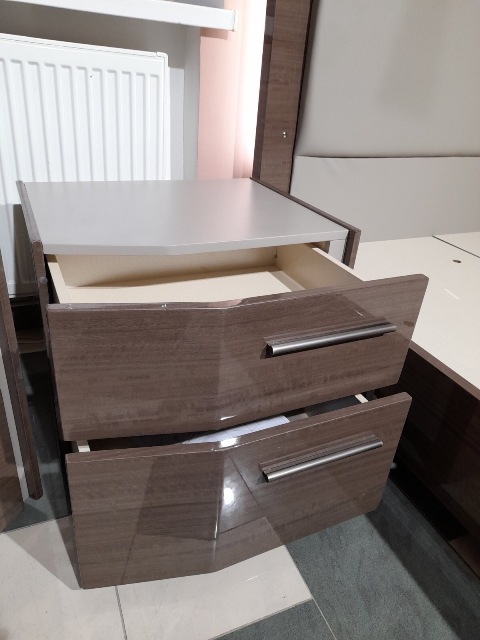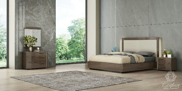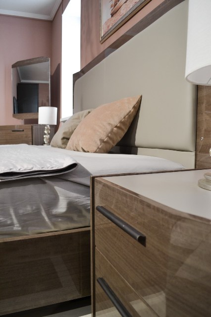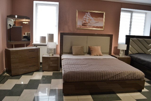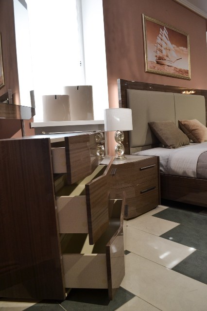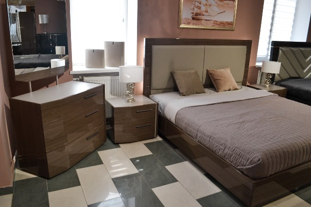 Стильні горіхові меблі у спальню. Меблі виготовлені з глянсового МДФ у кольорі горіх. У комплект спальні входить двоспальне ліжко 1800*2000, 2 тумбочки, комод із дзеркалом