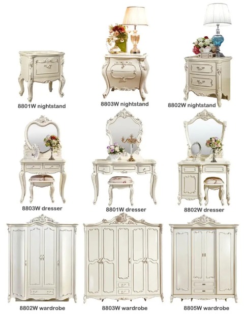 Білі різьблені меблі для спальні Ізабель у стилі бароко представлені у нашому магазині меблів у білому кольорі з патиною шампань. Велике різьблене узголів’я виготовлене в стилі капітоні зі стразами Сваровські. Тумбочки та туалетні столики можна підібрати з каталогу. Шафи є в наявності у різних розмірах.