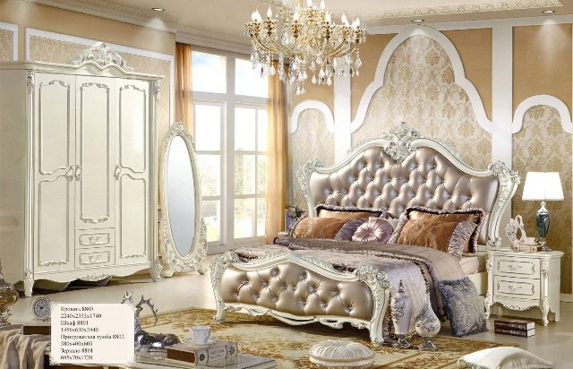 Білі класичні меблі для спальні Лаванда в стилі бароко представлені у великому комплекті. Ліжко виконане з м’яким узголів’ям та ногами зі стразами Сваровські у розмірі L2240*W2355*H1740. У спальному гарнітурі Лаванда Ви зможете вибрати тумбочки, туалетні столики, шафи різних розмірів.