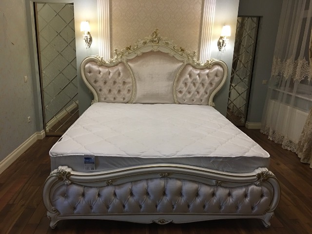 Класичне дерев’яне ліжко із золотом Людовик у розмірі -2230*1750*2140. Ліжко Людовік чудово прикрасить інтер’єр спальні у класичному стилі. Оббивка двоспального ліжка привертає увагу красою та багатством тканини. Різьблена корона на узголів’ї ліжка надає королівської величі та багатства в інтер’єрі.
