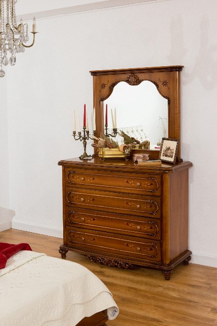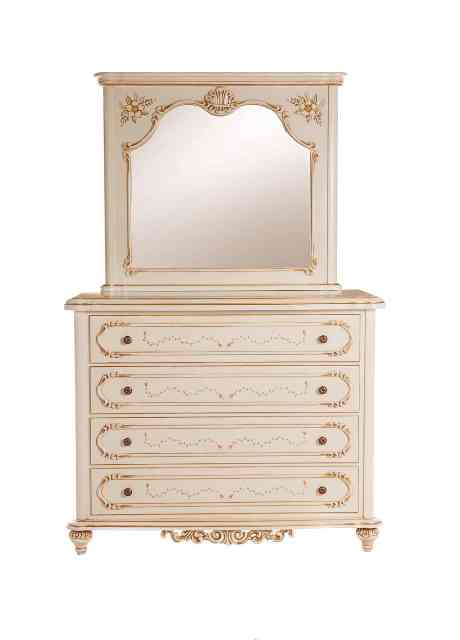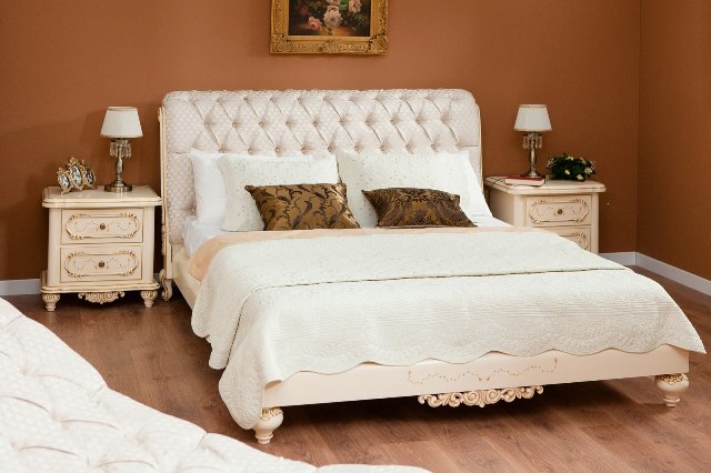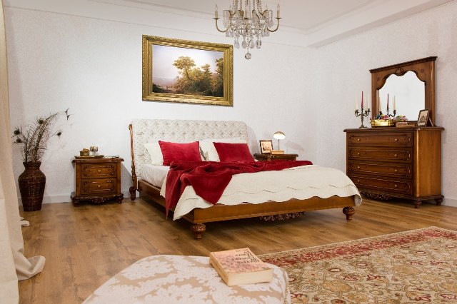 Класичні різьблені меблі для спальні Примавера. Меблі виготовлені з натурального дерева з малюнком на фасадах. Двоспальне ліжко з м’яким узголів’ям (тканину можна вибрати за каталогом) красиво підкреслить інтер’єр спальні. Такі меблі для спальні підійдуть і для класичного інтер’єру, так і для інтер’єру в стилі Прованс.