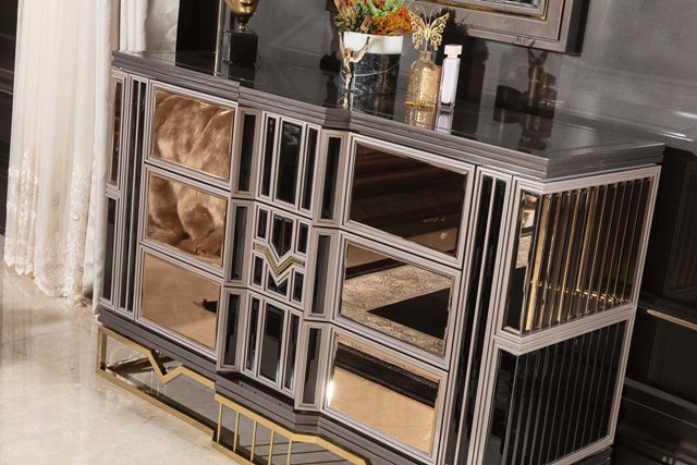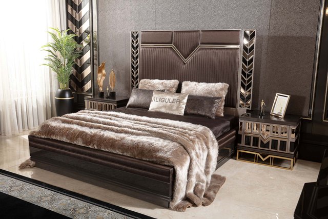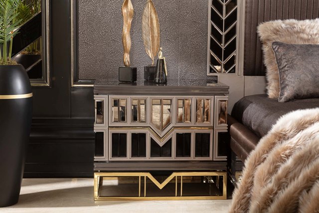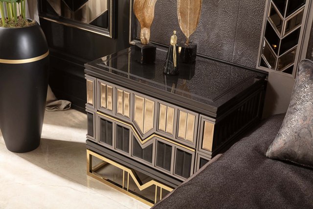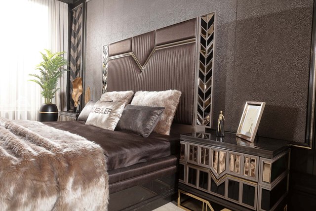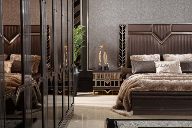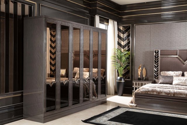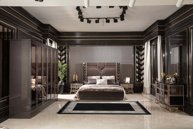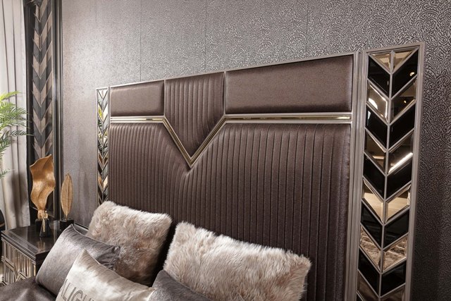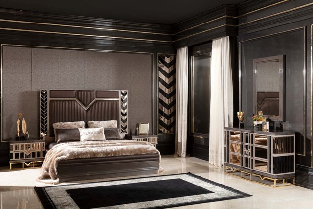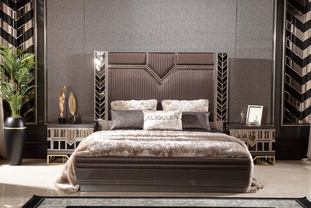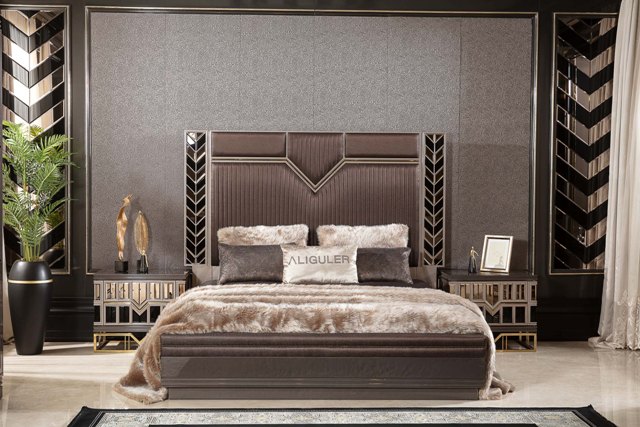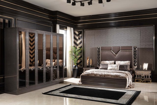 Красиві сучасні меблі для спальні Астерія від турецької фабрики виробника. Спальня зроблена з дерева, МДФ в цвктк димчастий горіх, попіл. Така спальня гарно виглядатиме в інтер’єрі спальні АРТ-Деко. Спальню можна купувати повним комплектом або окремими одиницями меблів – ліжко, тумбочки, комод, шафа.