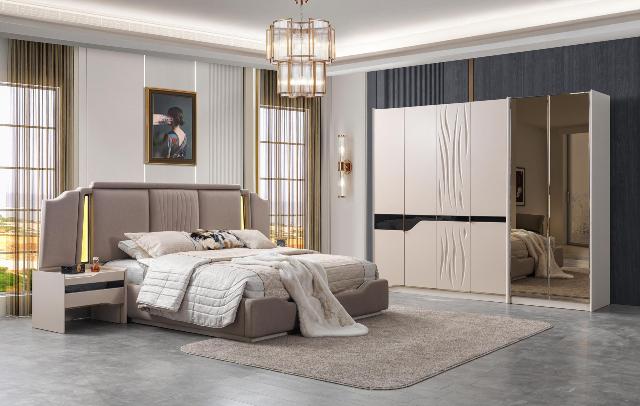 Спальня Детройт зроблена в ніжних бежево-кремових кольорах. Спальню можна купити повним комплектом або взяти окремо по одиницях – м’яке двоспальне ліжко, тумбочки, столик туалетний, шафа 6 дверей.