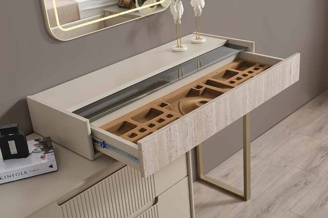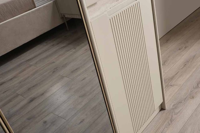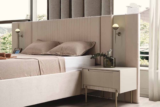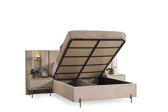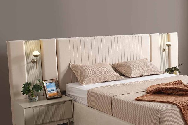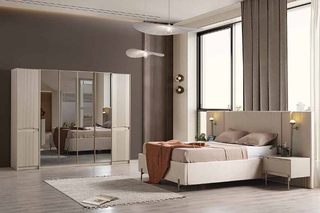 Гарний сучасний спальний гарнітур Орландо від турецької фабрики виробника зроблена з кремового кольору МДФ. Гарне м’яке ліжко з великим узголів’ям підкреслить інтер’єр будь-якої спальні. Двоспальне ліжко обладнане підйомним механізмом, що дає можливість додаткового зберігання речей. Велика шафа обладнана полицями та ящиками для одягу.