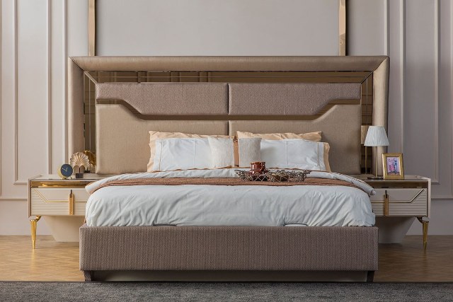 У нашому магазині меблів у Києві можна купити турецькі меблі для спальні Оптімус. Спальня зроблена з МДФ високої якості із золотою дизайнерською обробкою на фасадах. У комплект спальні входить – ліжко, тумбочки, туалетний столик, шафа для одягу. Спальню можна купити повним комплектом або взяти ліжко та 2 тумбочки. Додаткову інформацію уточнюйте у менеджера компанії.