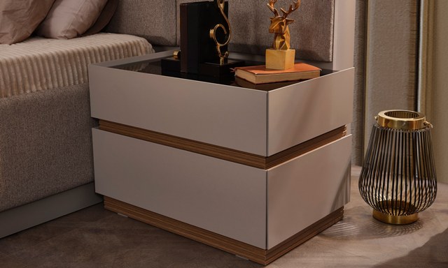 Приліжкова сучасна тумбочка Плюс у бежевому кольорі з декором у горіховому кольорі.