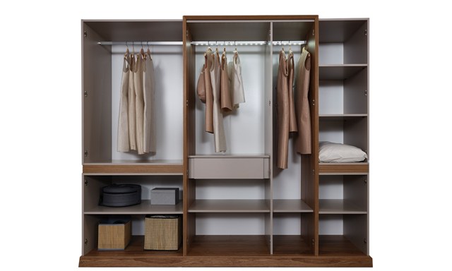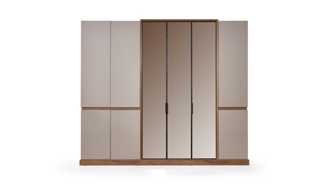 Велика шафа в сучасному стилі з дзеркалами Плюс виготовлена з МДФ високої якості в бежевому кольорі (мокко, латте). Шафа розроблена дизайнерами з урахуванням усіх потреб для зберігання речей. У шафі є і полиці та штанги для вішалок та ящик для дрібниць.