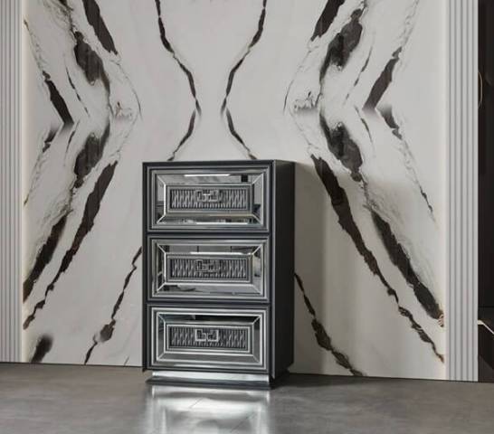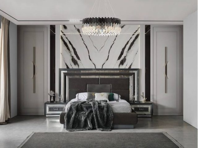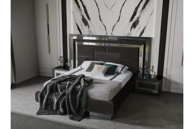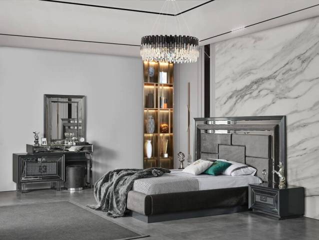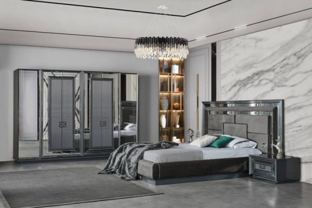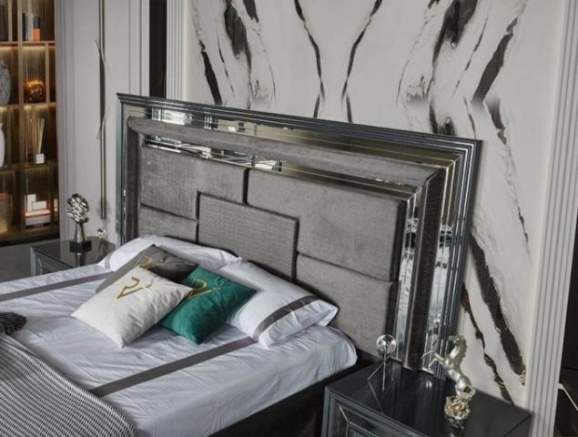 Срібна спальня Аспендос (Aspendos) від турецької фабрики виробника представлена в нашому магазині меблів у повному комплекті-ліжко з механізмом, 2 тумбочки, туалетний стіл із дзеркалом, комод для білизни, шафа 6 брей. Спальня зроблена з МДФ із дзеркальним оздобленням. Така спальня добре підкреслить інтер’єр спальні у стилі АРТ-Деко.