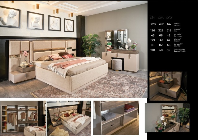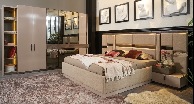 Спальня Берліс зроблена зі МДФ високої якості у бежевому кольорі. Гарне велике заголів’я декороване м’якими квадратами з підсвічуванням. Підйомний механізм, встановлений у ліжку, дає можливість для зберігання речей. Вся спальня Берліс виконана у поєднанні кольорів бежевого та горіхового.