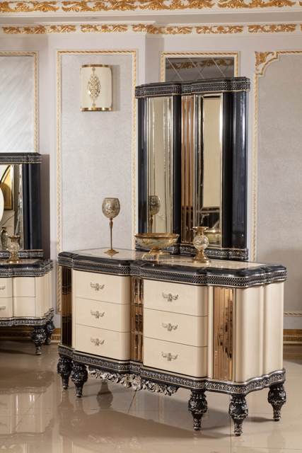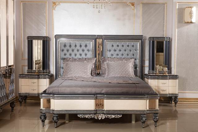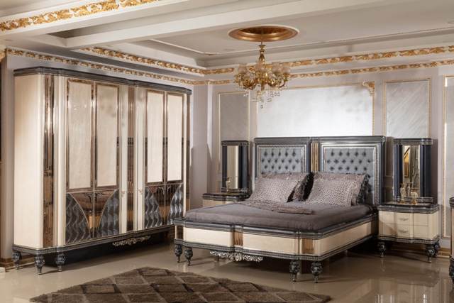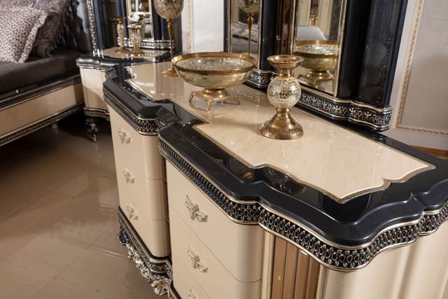 Турецькі меблі для спальні Ванесса виконані з натурального дерева та МДФ. У цій колекції зроблені світлі глянсові фасади з мармуровим ефектом. У комплект входить ліжко 1800*2000, 2 тумбочки, комод з дзеркалом, пуф, шафа 6 дверей. Можна придбати повний комплект меблів для спальні Ванесса або ліжко та 2 тумбочки.
