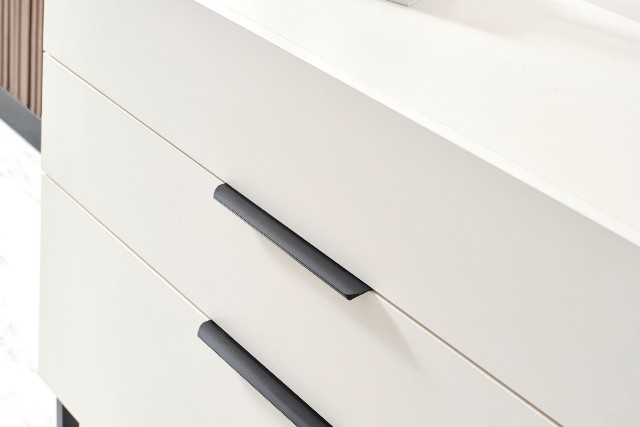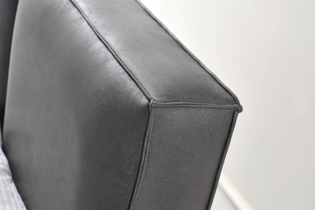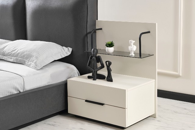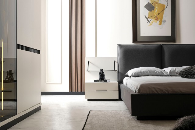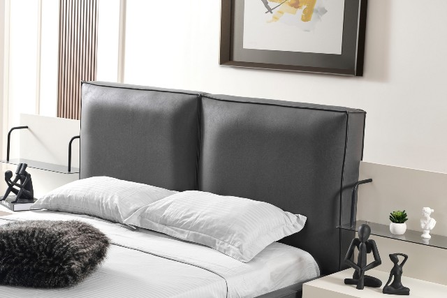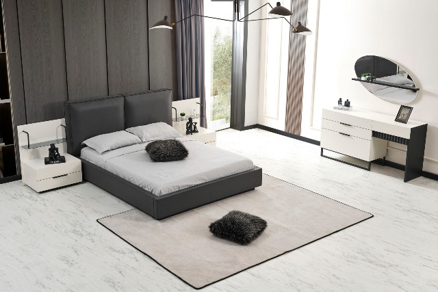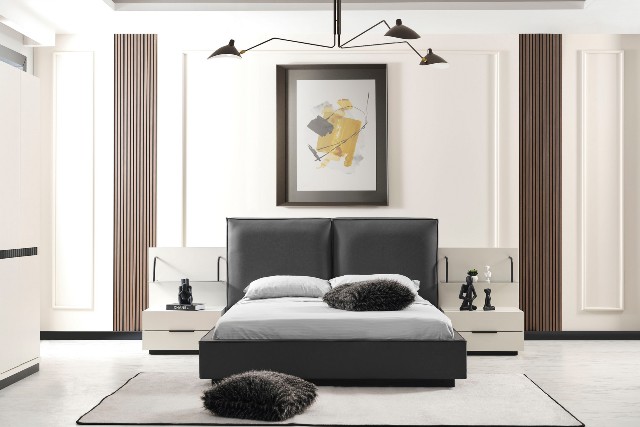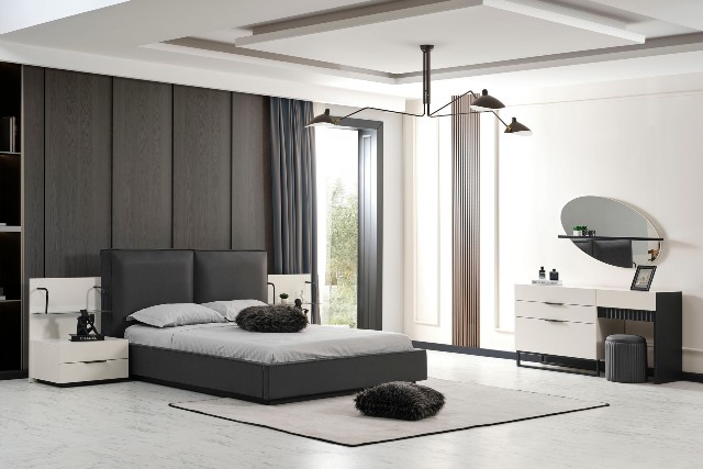 Спальня Сапфір від турецької фабрики виробника представлена у нашому магазині меблів у Києві. Спальня Сапфір зроблена в комбінації білого та темно-графітового кольору. Темне м’яке ліжко зроблене з еко-шкіри нового зразка, яке не піддається не тимчасовій не погодній корізії. За своїм виглядом просте ліжко красиво обіграно тумбочками з поличками схожими на етажерку.