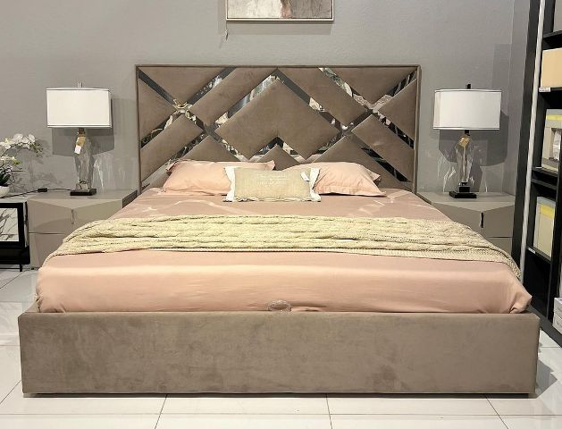 Бежеве двоспальне ліжко Меджик у розмірі спального місця 1800*2000. Загальний розмір: 1920x2150x1400. Ліжко зроблене з підйомним механізмом та нішою для зберігання білизни. Ліжко виготовлене з велюрової тканини Багіра 33.