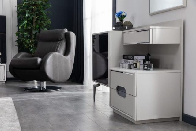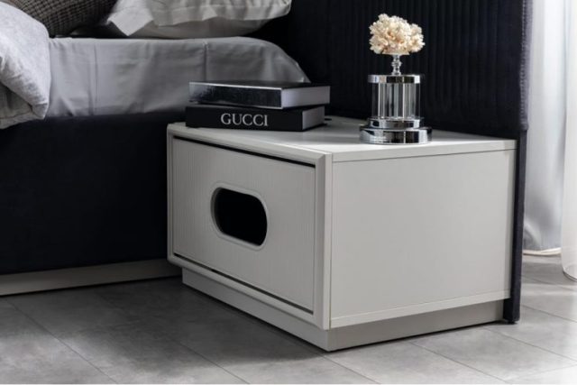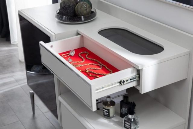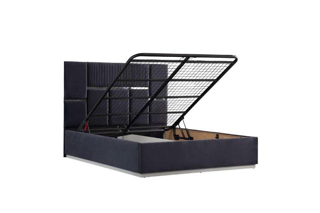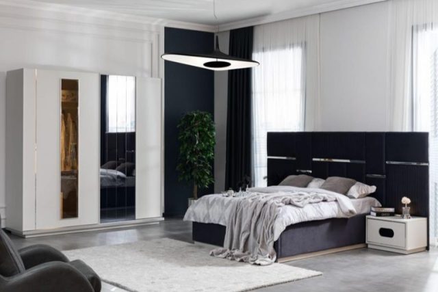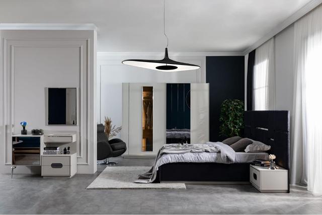 Комплект меблів для спальні Делон зроблений із білого МДФ. У цій колекції представлено чорне ліжко з декором та підйомним механізмом. За бажання клієнта ліжко можна зробити в будь-якому іншому кольорі тканини (вибрати можна за каталогом).
