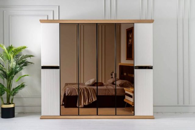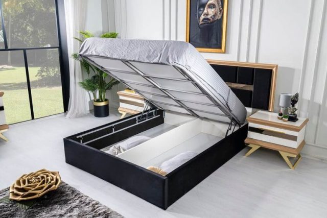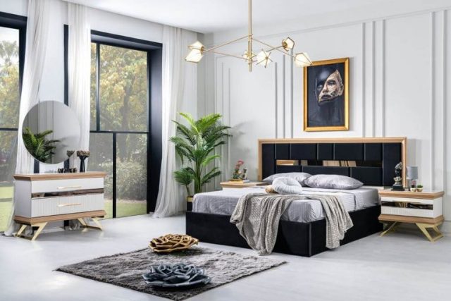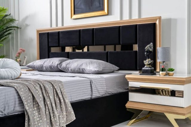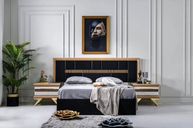 Красиві сучасні меблі для спальні Париж. Спальня зроблена із МДФ у поєднанні кольорів горіх, білий з елементами золота. Контрастне ліжко зроблене у чорному велюрі з декором із золота. Двоспальне ліжко із підйомним механізмом. Прекрасно підійде в чоловічу спальню або підліткову для хлопчика.