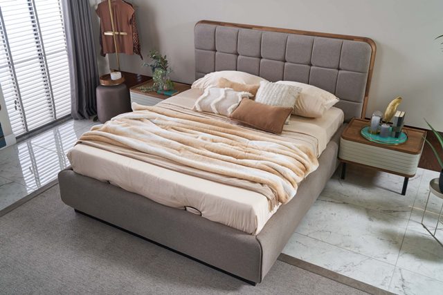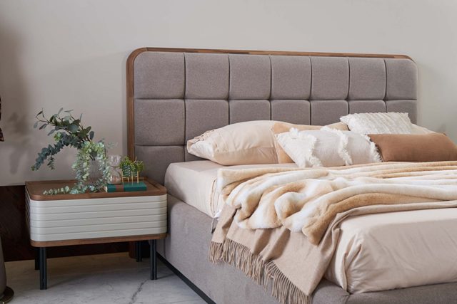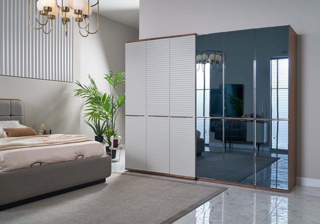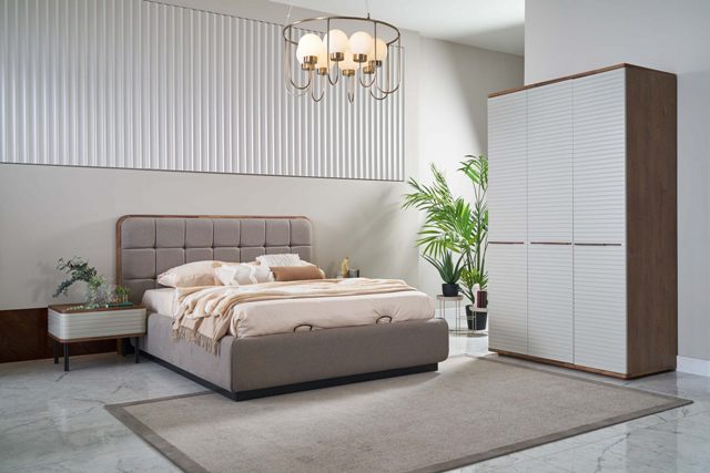 Цікава модель меблів для спальні “Сохо” від турецької фабрики виробника. Красиве м’яке ліжко з підйомним механізмом добре гармонує з тумбочками, комодом з дзеркалом, шафою. Фасади комбіновані – білий і горіх. Ви можете вибрати шафу будь-якого розміру.