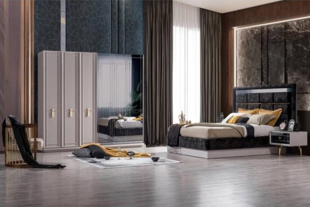 Світлі меблі для спальні Белла турецького виробництва представлені в нашому інтернет-магазині як комплект у стилі модерн. Ліжко з підйомним механізмом, 2 тумбочки, туалетний стіл із дзеркалом та шафа 6 дверей. Спальня цікава тим, що фасади меблів оздоблені дзеркальними фасадами. Фурнітура та декоративне оздоблення йде в золоті.