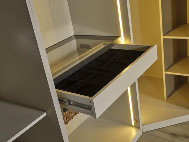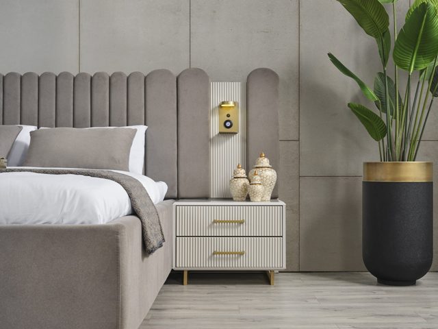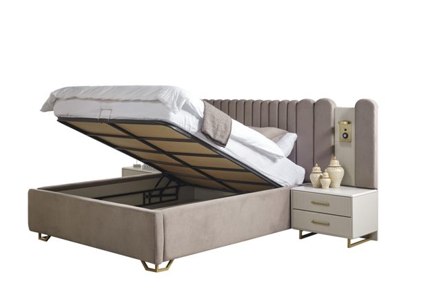 Сучасні меблі для спальні Лайн виготовлені зі МДФ високої якості. Велике двоспальне м’яке ліжко з великим декоративним узголів’ям з велюру чудово підкреслить інтер’єр Вашої кімнати. Меблі зроблені з білого МДФ із золотою або чорною фурнітурою. М’яке ліжко оснащене підйомним механізмом, що дає додаткове місце для зберігання. У цій колекції шафа модульна і можна вибрати за своїми розмірами. Додаткову інформацію уточнюйте у менеджера компанії.
