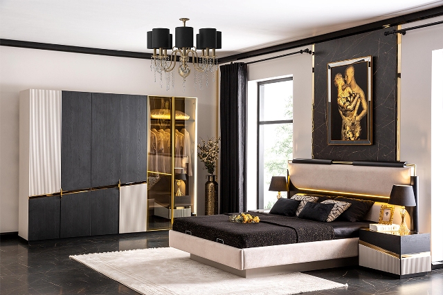 Спальня Лінія від турецької фабрики виробника. Спальня зроблена у біло-чорному кольорі із золотим декором на фасадах. У комплект входить красиве сучасне ліжко з підсвічуванням на узголів’ї, тумбочки, комод для білизни з дзеркалом, шафа для одягу.